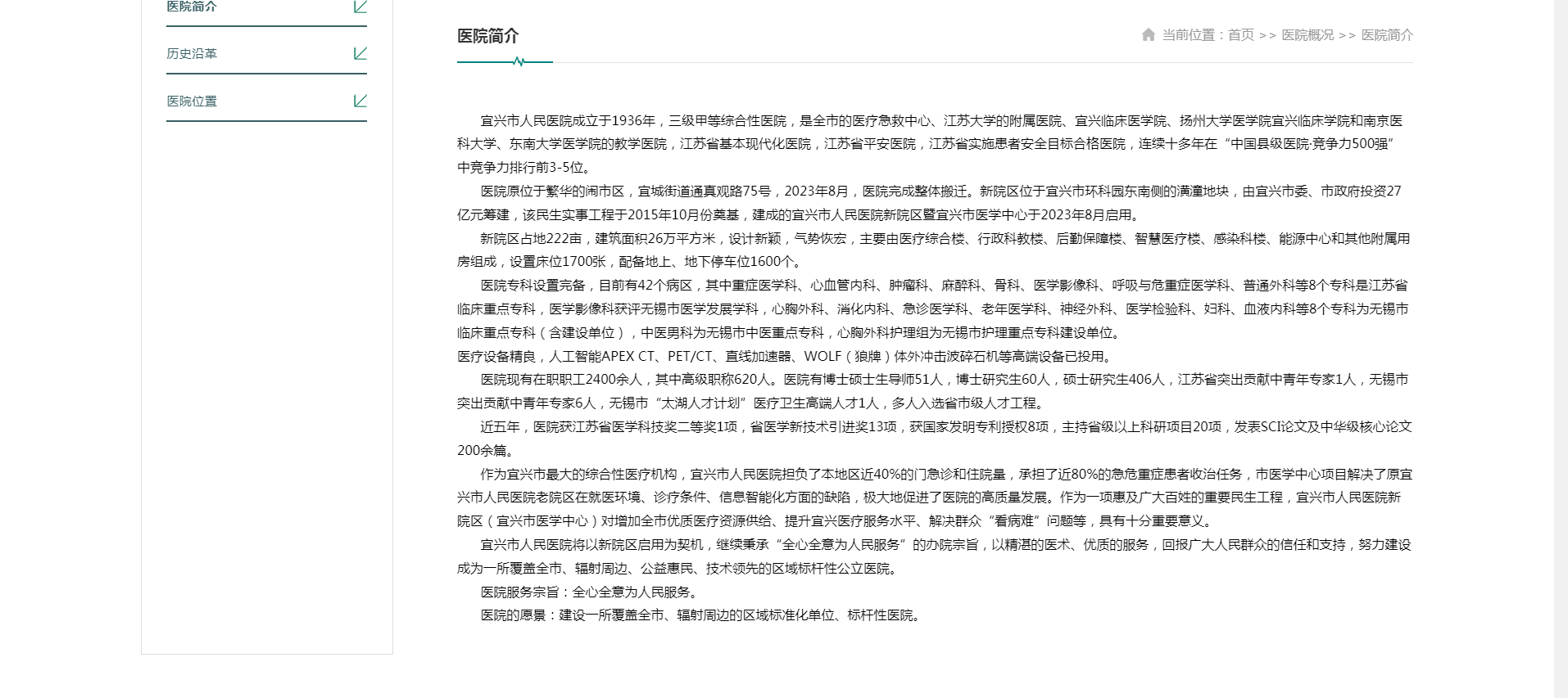 宜興市人民醫(yī)院成立于1936年,三級甲等綜合性醫(yī)院,是全市的醫(yī)療急救中心、江蘇大學(xué)的附屬醫(yī)院、宜興臨床醫(yī)學(xué)院、揚(yáng)州大學(xué)醫(yī)學(xué)院宜興臨床學(xué)院和南京醫(yī)科大學(xué)、東南大學(xué)醫(yī)學(xué)院的教學(xué)醫(yī)院,江蘇省基本現(xiàn)代化醫(yī)院,江蘇省平安醫(yī)院,江蘇省實(shí)施患者安全目標(biāo)合格醫(yī)院,連續(xù)十多年在“中國縣級醫(yī)院·競爭力500強(qiáng)”中競爭力排行前3-5位。 醫(yī)院原位于繁華的鬧市區(qū),宜城街道通真觀路75號,2023年8月,醫(yī)院完成整體搬遷。新院區(qū)位于宜興市環(huán)科園東南側(cè)的潢潼地塊,由宜興市委、市政府投資27億元籌建,該民生實(shí)事工程于2015年10月份奠基,建成的宜興市人民醫(yī)院新院區(qū)暨宜興市醫(yī)學(xué)中心于2023年8月啟用。 新院區(qū)占地222畝,建筑面積26萬平方米,設(shè)計(jì)新穎,氣勢恢宏,主要由醫(yī)療綜合樓、行政科教樓、后勤保障樓、智慧醫(yī)療樓、感染科樓、能源中心和其他附屬用房組成,設(shè)置床位1700張,配備地上、地下停車位1600個。 醫(yī)院??圃O(shè)置完備,目前有42個病區(qū),其中重癥醫(yī)學(xué)科、心血管內(nèi)科、腫瘤科、麻醉科、骨科、醫(yī)學(xué)影像科、呼吸與危重癥醫(yī)學(xué)科、普通外科等8個??剖墙K省臨床重點(diǎn)專科,醫(yī)學(xué)影像科獲評無錫市醫(yī)學(xué)發(fā)展學(xué)科,心胸外科、消化內(nèi)科、急診醫(yī)學(xué)科、老年醫(yī)學(xué)科、神經(jīng)外科、醫(yī)學(xué)檢驗(yàn)科、婦科、血液內(nèi)科等8個專科為無錫市臨床重點(diǎn)??疲êㄔO(shè)單位),中醫(yī)男科為無錫市中醫(yī)重點(diǎn)專科,心胸外科護(hù)理組為無錫市護(hù)理重點(diǎn)??平ㄔO(shè)單位。 醫(yī)療設(shè)備精良,人工智能APEX CT、PET/CT、直線加速器、WOLF(狼牌)體外沖擊波碎石機(jī)等高端設(shè)備已投用。 醫(yī)院現(xiàn)有在職職工2400余人,其中高級職稱620人。醫(yī)院有博士碩士生導(dǎo)師51人,博士研究生60人,碩士研究生406人,江蘇省突出貢獻(xiàn)中青年專家1人,無錫市突出貢獻(xiàn)中青年專家6人,無錫市“太湖人才計(jì)劃”醫(yī)療衛(wèi)生高端人才1人,多人入選省市級人才工程。 近五年,醫(yī)院獲江蘇省醫(yī)學(xué)科技獎二等獎1項(xiàng),省醫(yī)學(xué)新技術(shù)引進(jìn)獎13項(xiàng),獲國家發(fā)明專利授權(quán)8項(xiàng),主持省級以上科研項(xiàng)目20項(xiàng),發(fā)表SCI論文及中華級核心論文200余篇。 作為宜興市最大的綜合性醫(yī)療機(jī)構(gòu),宜興市人民醫(yī)院擔(dān)負(fù)了本地區(qū)近40%的門急診和住院量,承擔(dān)了近80%的急危重癥患者收治任務(wù),市醫(yī)學(xué)中心項(xiàng)目解決了原宜興市人民醫(yī)院老院區(qū)在就醫(yī)環(huán)境、診療條件、信息智能化方面的缺陷,極大地促進(jìn)了醫(yī)院的高質(zhì)量發(fā)展。作為一項(xiàng)惠及廣大百姓的重要民生工程,宜興市人民醫(yī)院新院區(qū)(宜興市醫(yī)學(xué)中心)對增加全市優(yōu)質(zhì)醫(yī)療資源供給、提升宜興醫(yī)療服務(wù)水平、解決群眾“看病難”問題等,具有十分重要意義。 宜興市人民醫(yī)院將以新院區(qū)啟用為契機(jī),繼續(xù)秉承“全心全意為人民服務(wù)”的辦院宗旨,以精湛的醫(yī)術(shù)、優(yōu)質(zhì)的服務(wù),回報(bào)廣大人民群眾的信任和支持,努力建設(shè)成為一所覆蓋全市、輻射周邊、公益惠民、技術(shù)領(lǐng)先的區(qū)域標(biāo)桿性公立醫(yī)院。