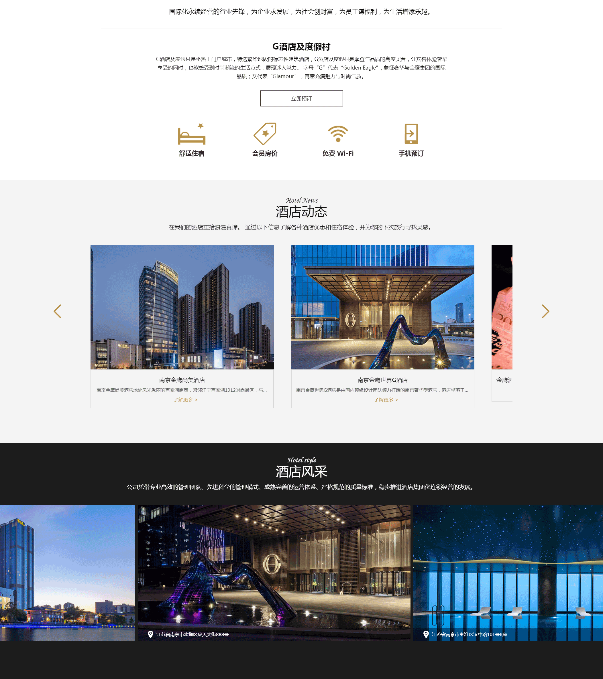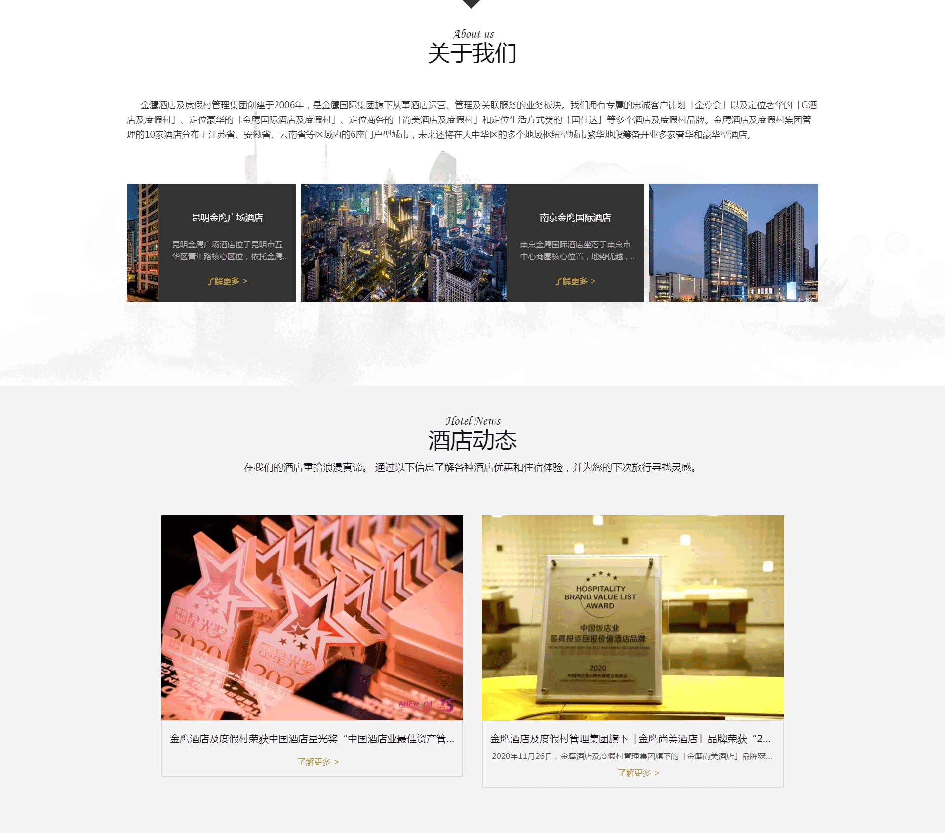 金鷹酒店及度假村管理集團(tuán)創(chuàng)建于2006年,是金鷹國(guó)際集團(tuán)旗下從事酒店運(yùn)營(yíng)、管理及關(guān)聯(lián)服務(wù)的業(yè)務(wù)板塊。我們擁有專(zhuān)屬的忠誠(chéng)客戶(hù)計(jì)劃「金尊會(huì)」以及定位奢華的「G酒店及度假村」、定位豪華的「金鷹國(guó)際酒店及度假村」、定位商務(wù)的「尚美酒店及度假村」和定位生活方式類(lèi)的「國(guó)仕達(dá)」等多個(gè)酒店及度假村品牌。金鷹酒店及度假村集團(tuán)管理的10家酒店分布于江蘇省、安徽省、云南省等區(qū)域內(nèi)的6座門(mén)戶(hù)型城市,未來(lái)還將在大中華區(qū)的多個(gè)地域樞紐型城市繁華地段籌備開(kāi)業(yè)多家奢華和豪華型酒店。