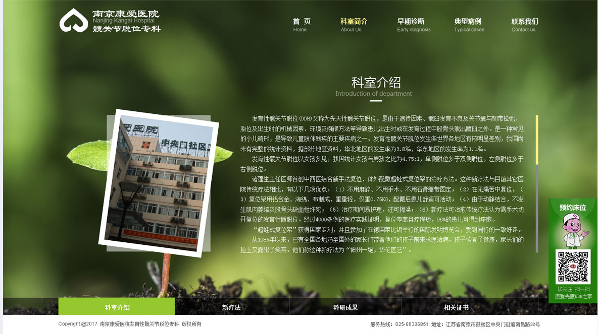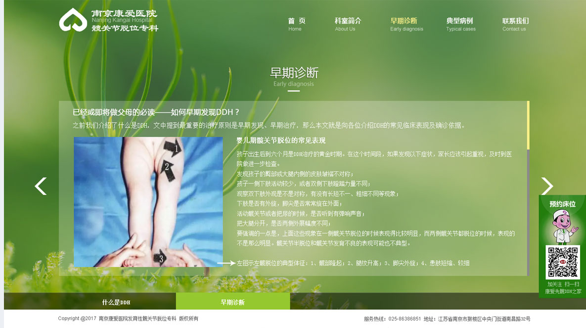 康愛醫(yī)院發(fā)育性髖關(guān)節(jié)脫位(DDH)又稱為先天性髖關(guān)節(jié)脫位,是由于遺傳因素、關(guān)節(jié)囊與韌帶松弛、胎位及出生時的機(jī)械因素、環(huán)境及襁褓方法等導(dǎo)致患兒出生時或在發(fā)育過程中股骨頭脫出髖臼之外。是一種常見的小兒畸形,是導(dǎo)致肢體殘疾的主要疾病之一。 諸蓬生醫(yī)師1985年首創(chuàng)中西醫(yī)結(jié)合新手法復(fù)位、體外配戴超蛙式復(fù)位架的治療方法